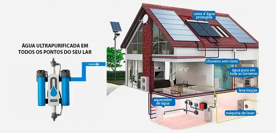 Um equipamento compacto, que trabalha em alto fluxo de filtração. Evita que contaminantes diversos presentes na água de distribuição se acumulem em caixas d´água e tubulações, bloqueando assim o contato diário dos usuários com elementos nocivos.