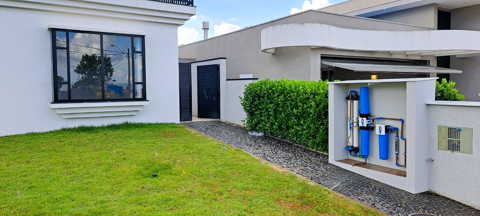 Pode ser colocado na entrada da casa ou próximo à caixa d’água. Na posição horizontal ou vertical (para espaços menores).